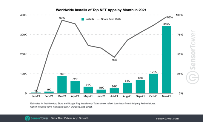 - NFT collectibles app VeVe Collectibles is leading the NFT trading space on mobile with more than $100 million in consumer spending, reports Sensor Tower. This puts it ahead of Fantastec, SWAP, OurSong and Sweet, which focus on collectibles rather than wallet functionality. Though VeVe only launched in October 2020, it’s already leading the pack with 744,000 installs and $112.5 million in spending. The remaining apps have a collective 485,000 installs and $384,000 in spending.