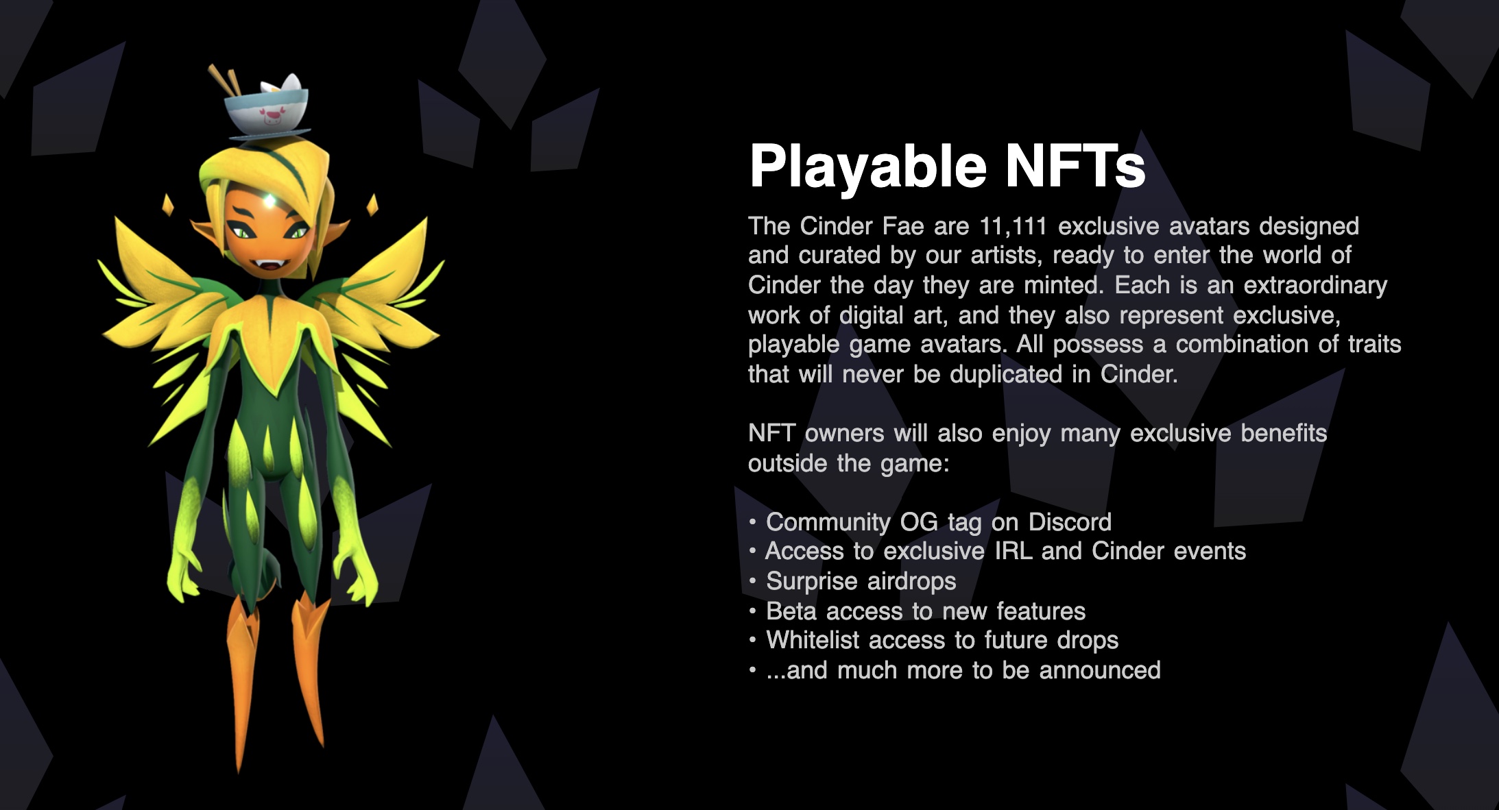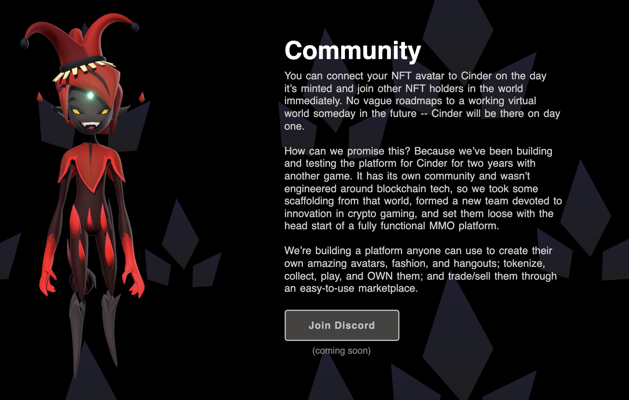 Cinder’s NFTs would instead allow users to tokenize then sell and trade their creations, retaining more of the total revenue. Stacey, in the Discord AMA, said Cinder’s marketplace will allow players to retain 96% of the transaction, with Cinder only taking 4%.