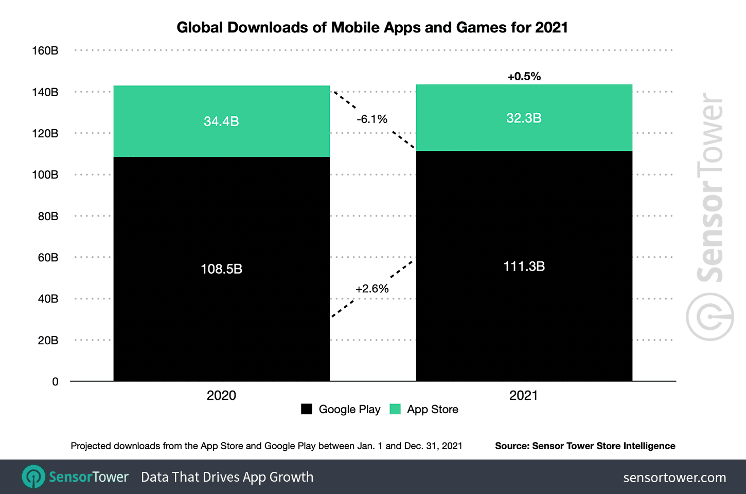 But Apple’s App Store saw new app installs drop. This year, downloads will have declined 6.1% from 34.4 billion in 2020 to 32.3 billion, Sensor Tower estimates.