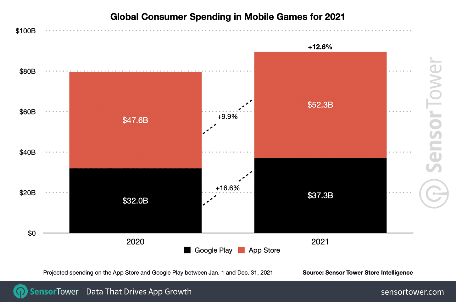 Mobile games continue to pull in the lions’ share of global app revenue, as in previous years. In 2021, mobile game spending will reach $89.6 billion across the App Store and Google Play, up 12.6% year over year from the $79.6 billion spent in 2020.