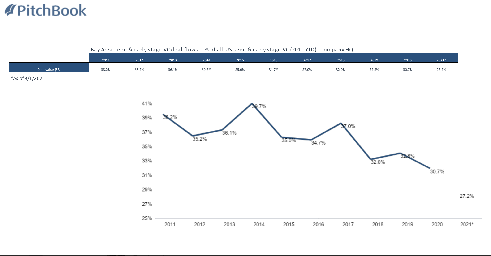 In recent years, Bay Area startups have accounted for a smaller percentage of U.S. VC investment, according to “Beyond Silicon Valley,” a new report co-produced by venture firm Revolution and PitchBook. So far in 2021, only about 27% of U.S. VC dollars have gone to Bay Area startups. It’s been more than 10 years since that percentage fell below 30%, the study said, despite the fact that the country is on track to see record amounts of venture funding overall this year. We dug into the report and talked to Revolution CEO and Chairman Steve Case about the findings.