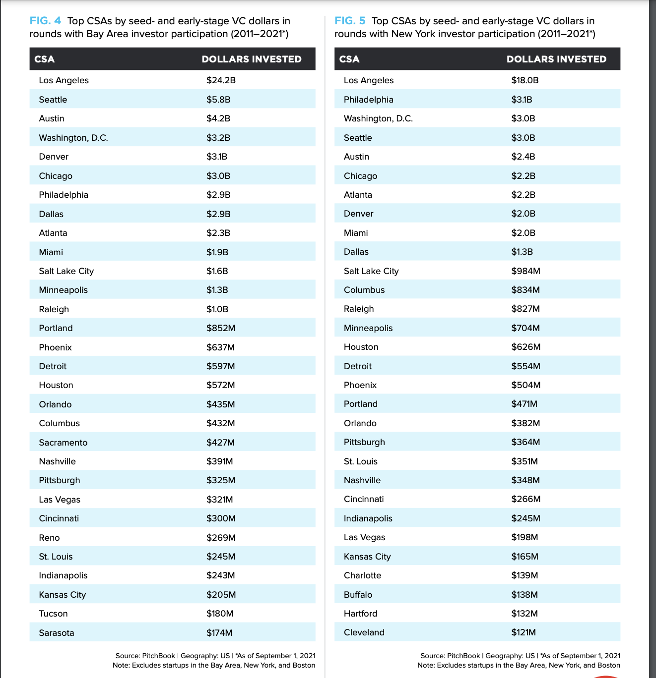 Startups in LA received a combined $42.2 billion of seed- and early-stage investment (defined as Series A or B) over that 10-year-period in rounds that included both Bay Area and New York City investor participation. See the chart below to see which other cities made the list.