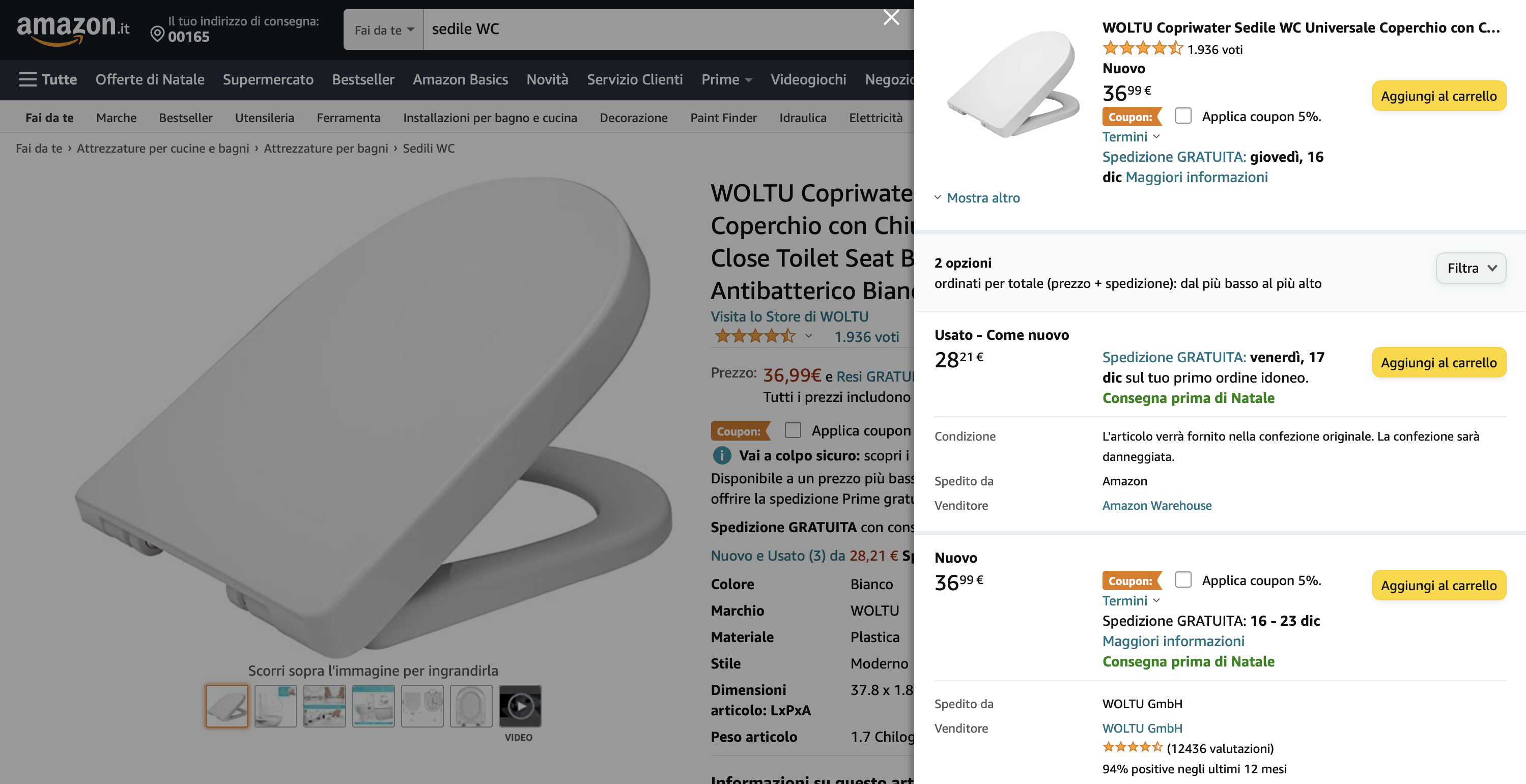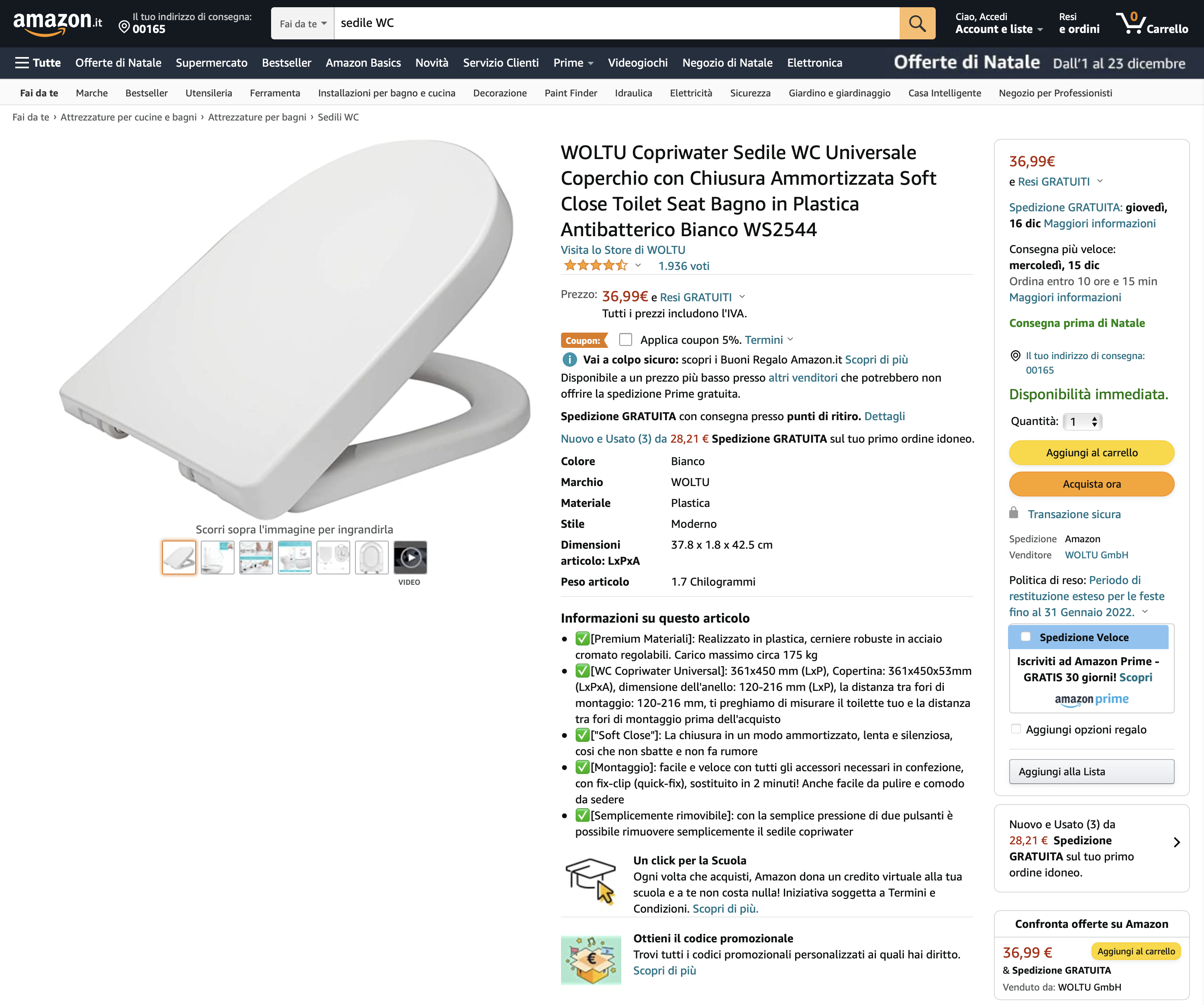 I tried to find a good example on Amazon.it and here’s what I found on this toilet seat. Amazon itself doesn’t sell the product directly. You can only get it from third-party sellers. By default, Amazon features WOLTU GmbH in the buy box. The item is shipped by Amazon as WOLTU GmbH uses FBA. And you can get free expedited shipping with Amazon Prime.