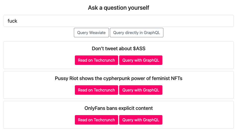 Bob was kind enough to not only spend a few hours talking me through his company, the market for searching unstructured data and how Weaviate works but also to scrape TechCrunch’s 2021 output and put it into a little GUI so that I could play around with it.