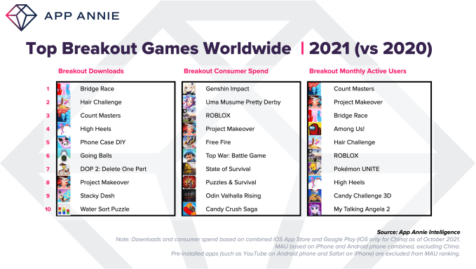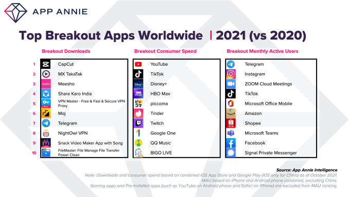 App Annie selected TikTok as a top “breakout” app for consumer spending the year. (It’s No. 2 on App Annie’s “breakout” chart that ranks the apps that saw the biggest change in the past 12 months.) But TikTok is also influencing other apps. For example, a video editing app called CapCut — a popular TikTok editing tool — was the No. 1 breakout app by downloads.