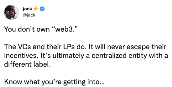 The core of Jack’s complaint is that leading web3 corporations are owned by venture capitalists, and therefore will have to live with venture incentives.