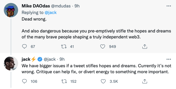 - On being critical of web3: After being criticized for “stifling” web3 work, Jack dismissed the complaint and said that “critiques” can help folks choose to work on more fulfilling projects.