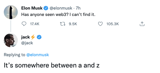 - On who will own web3: Elon Musk jumped into the fun to ask where web3 is, as he is struggling to find it. Jack then subtweets a16z, the venture capital firm, as the nexus point for web3 project funding, and therefore control.