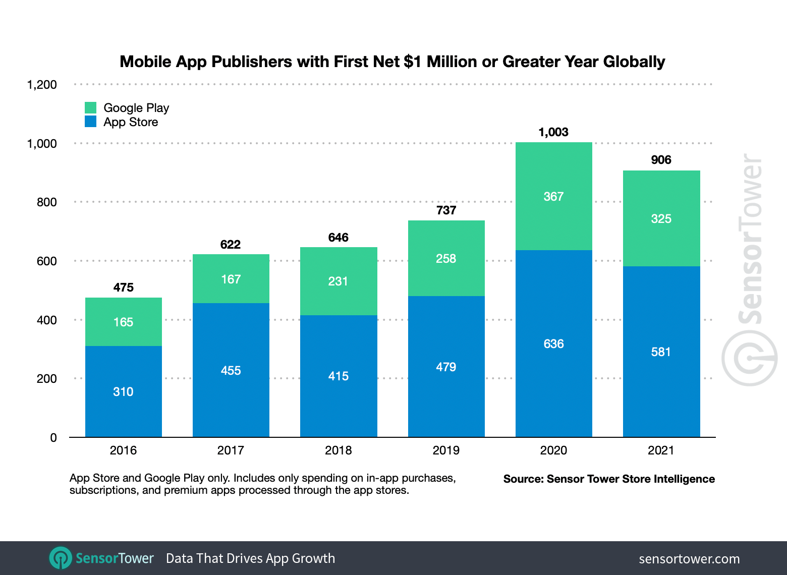 Sensor Tower is forecasting that the number of publishers set to see their first $1 million (or more) in annual net income in 2021 has nearly doubled since 2016. This year, more than 900 publishers will reach this milestone, up nearly 91% from the 475 who hit the milestone in 2016. This 900+ breaks down to 581 on iOS and 325 on Google Play, it notes.