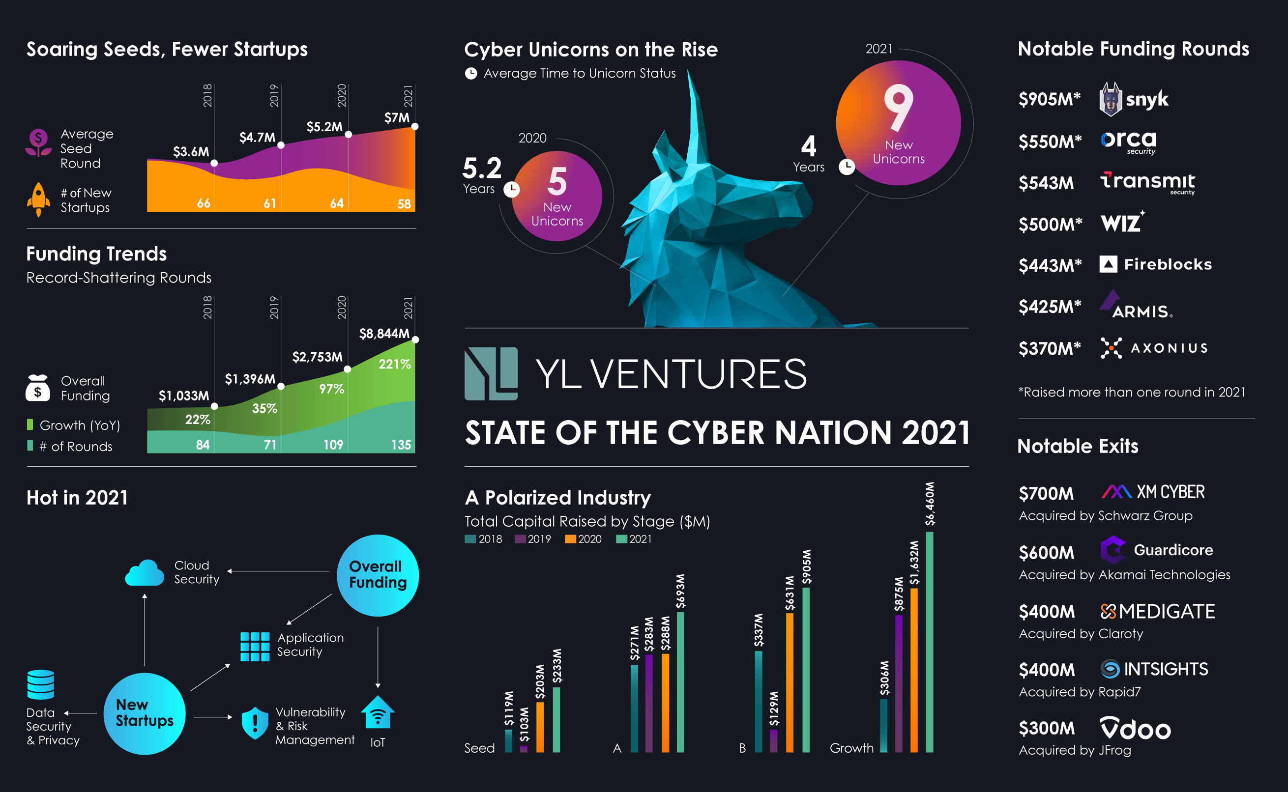 With larger growth rounds and the rush to reach massive valuations, unicorns are crowned earlier each year. Nine Israeli cybersecurity startups achieved unicorn status in 2021 — Aqua Security, At-Bay, Axonius, Claroty, Fireblocks, Noname Security, Orca Security, Transmit Security and Wiz — compared with 2020’s five. These mega-startups cut their time-to-unicorn by 23%, gaining their title in only four years as opposed to 5.2 years for unicorns in 2020.