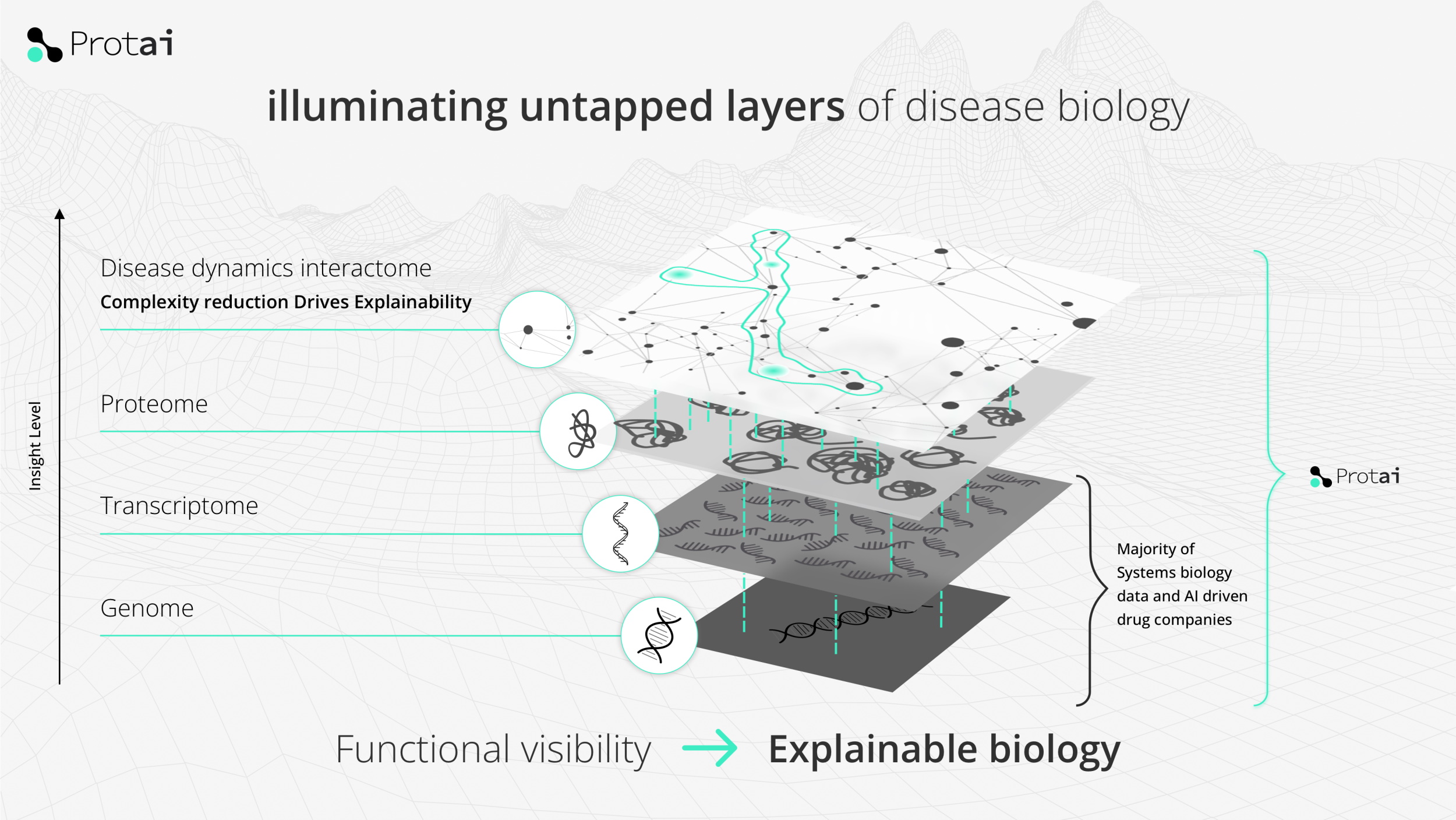 Where Protai fits into that stack is above the genome and transcription level, where genetic factors can be identified, and below the cells and systems layer, where problems become more obviously visible as symptoms.