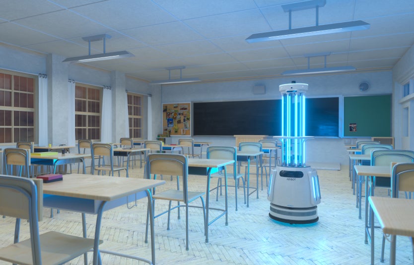 - ADIBOT, which comes in S (stationary) and A (autonomous) models. Of the latter, the company says, “ADIBOT-A is the fully-loaded autonomous disinfection solution that can be programmed and mapped to independently navigate one or multiple floor plans. ADIBOT-S provides 360-degree radiant light coverage, powerful UV-C disinfection, autonomous movement using U-SLAM mapping, secured app, dedicated server and cloud-based connectivity, automatic recharging, and intelligent safety features including the use of ‘risk mitigation’ cameras, PIR sensors.”