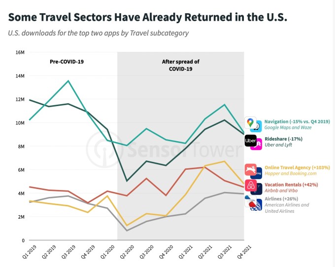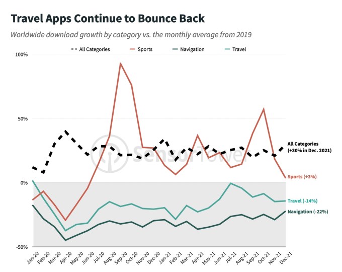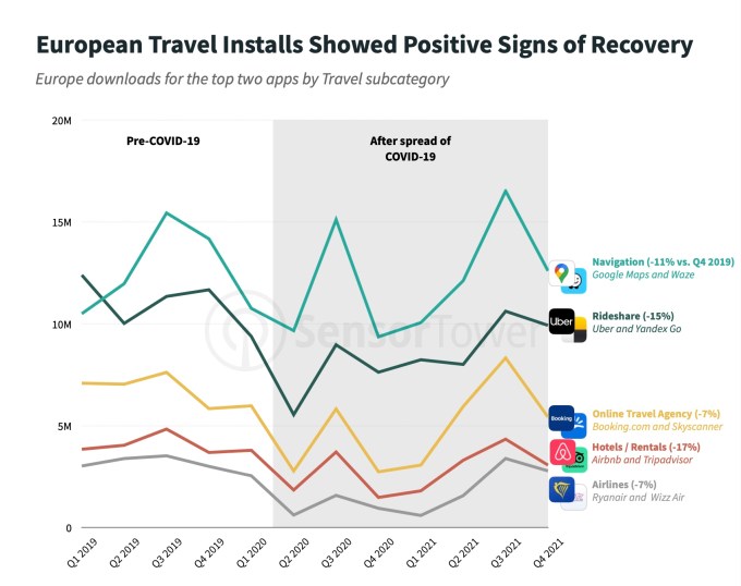 It’s clear the travel category, as a whole, still lives and dies by COVID’s ebbs and surges. As things began looking up in the summer months, for example, travel apps started to see a return to growth. And by the peak of summer travel in July 2021, travel apps had nearly reached their 2019 average, Sensor Tower said. But as the Omicron variant emerged, travel apps saw those gains start to subside. As of December 2021, travel apps were again down by 14% compared with 2019 levels, while navigation apps were down by 22%.