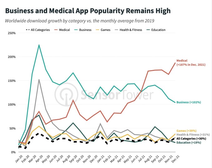 Medical apps, obviously, also saw increased use during the pandemic. (And if they’re a proxy for how well the fight against COVID is going, then things are not looking good!) The category has climbed significantly from 2019 levels, with download growth up by 187% in December 2021, compared with the monthly average in 2019.
