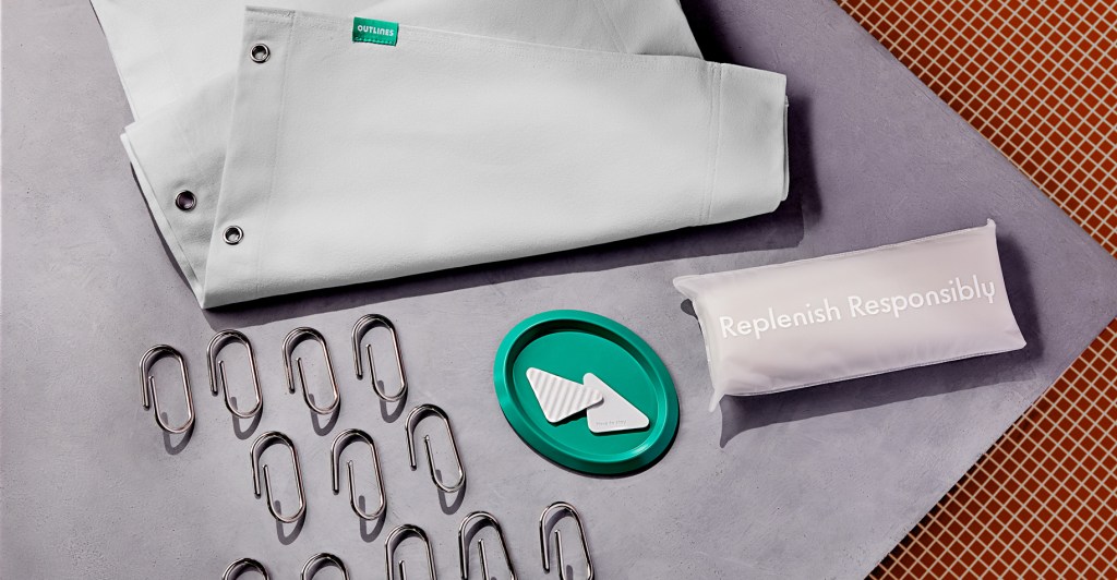 “I moved to New York from London about six years ago. Like all New Yorkers I moved into like an old apartment that required me to have like a shower liner — one of those plastic shower curtains. Coming from Europe, like I was very used to a door or a plexiglass screen on the shower, or a separate shower unit. I was caught in this constant dilemma; I would pick up my shower liner, three or four months would go by it would get slimy and gross,” Outlines co-founder Luke Barkley Young explains. “I was in this really awkward position where I’d want to get a new one, but I had this plastic-guilt of throwing it away. I was used to being able to recycle everything, and I just hated this constant pain point.”