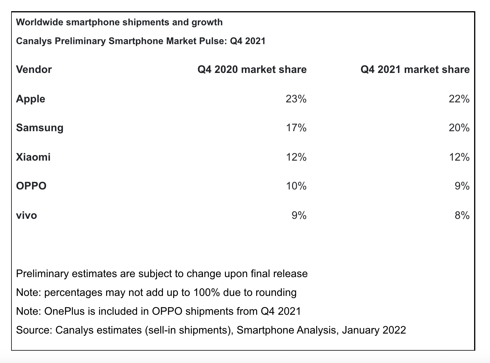 Samsung, meanwhile, dropped to second, from 23% to 20% of the total market. Chinese manufacturers Xiaomi, Oppo and Vivo rounded out the top five for Q4.