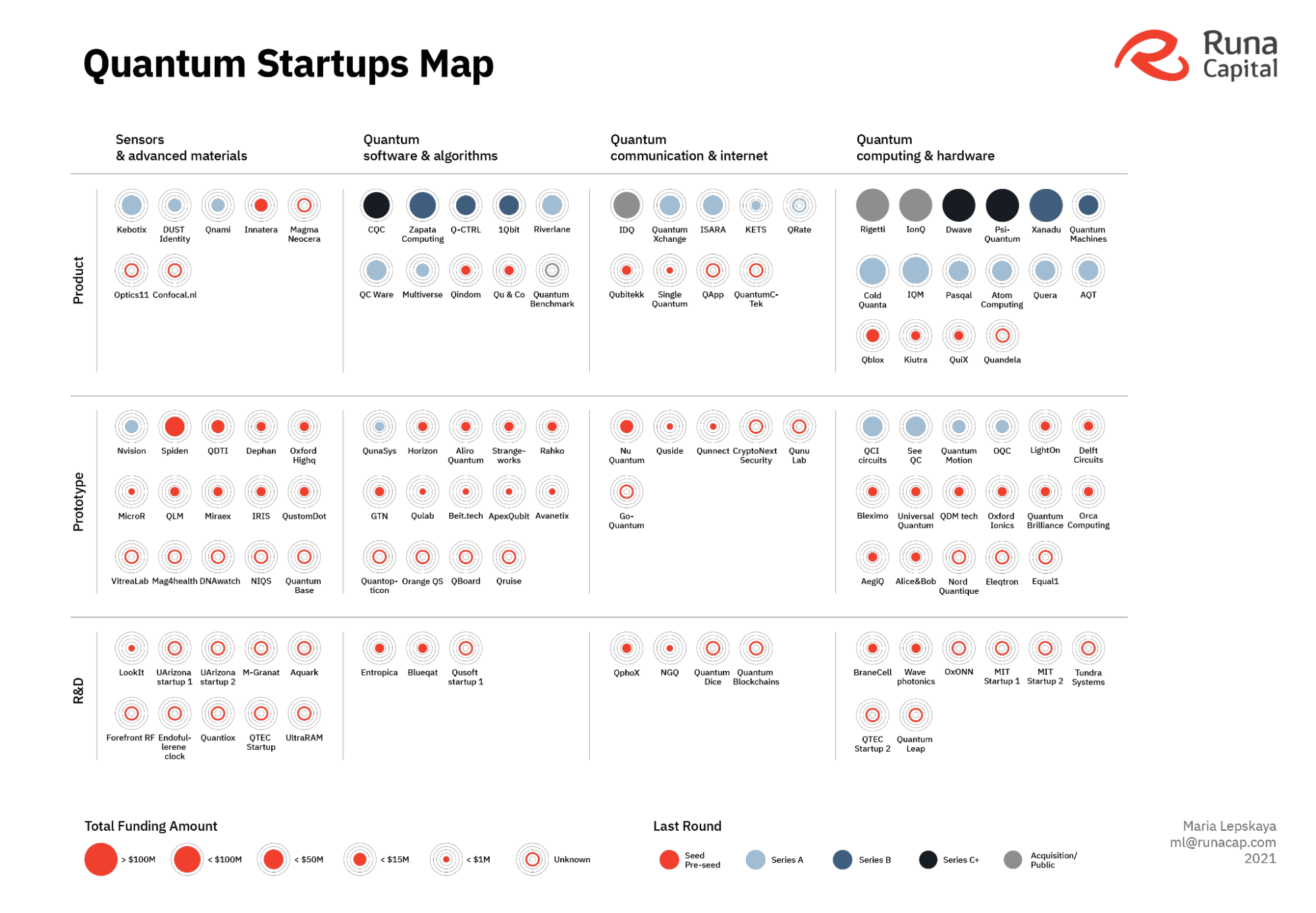 After the early success of quantum communication, our team decided to study the quantum landscape in more detail. At the time, it was not apparent if the quantum market even existed. We created a map of the quantum startups ecosystem that is divided into 12 quadrants, each corresponding to particular quantum technology and a stage of startups.