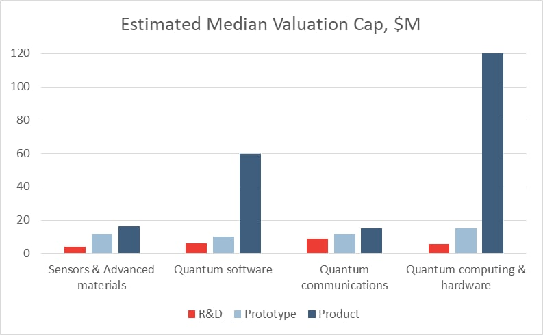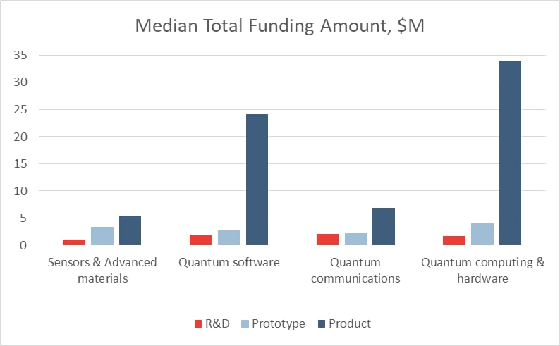 Quantum software startups come second in terms of funding. Interestingly, both hardware and software startups in this space see a pretty big jump in funding when they go from the prototype to the product stage. This trend reflects investors’ expectations of market maturity. However, quantum sensors and communications startups only see a small bump, perhaps because investors aren’t convinced about the viability of these markets yet.