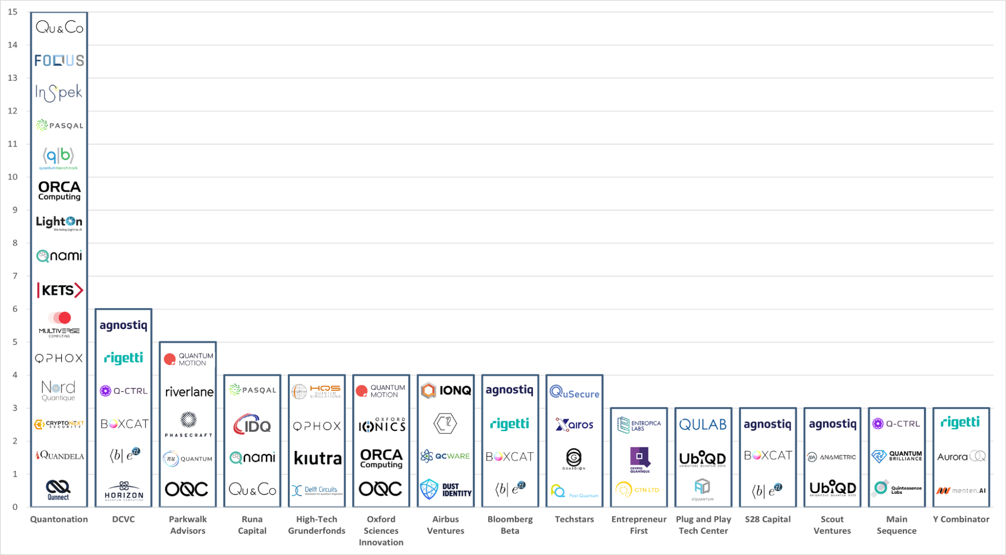 There is just a handful of investors betting on quantum startups around the world. According to Crunchbase, only 15 VCs, including venture capital funds and accelerators, have invested in at least three quantum startups. Together with entrepreneurship and university programs (Creative Destruction Lab and Innovate UK), incubators (European Innovation Council and AGORANOV), micro VCs (Acequia Capital), investment banks (Bpifrance), government offices (In-Q-Tel, National Science Foundation and SGInnovate) and agencies (EASME), this number increases to 30.