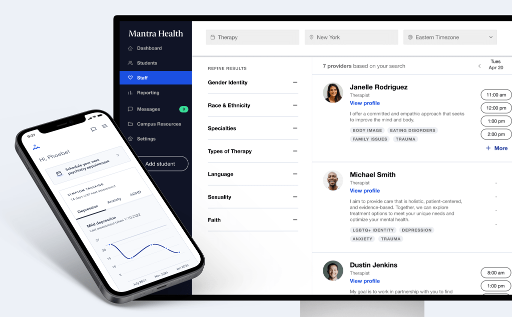 “Over the next year or so, we’ll introduce new digital-first treatments for patients, new specialties within our provider group, and continue to expand our payment mix,” Kennedy said. “Ultimately, Mantra will have a mental wellness pathway tailored to each student from the day they walk on campus to well after graduation.”