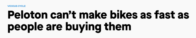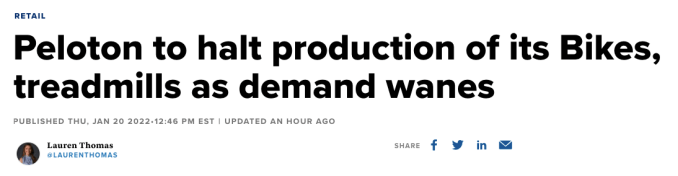 News broke today (shoutout CNBC for the scoop) that Peloton is halting production of its hardware for a bit. Compare and contrast the following headlines, the first from May 2020 via our friends at Quartz: