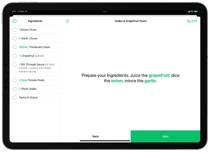 As you cook, you can switch into a guided experience where you move through the recipe on a step-by-step basis. You can also set multiple timers along the way, and tap on links within each to be reminded of the quantities you need. Many other apps force you to switch back and forth between ingredient lists and the steps, which can complicate matters when the recipe’s steps have to be implemented quickly or when hands are messy.