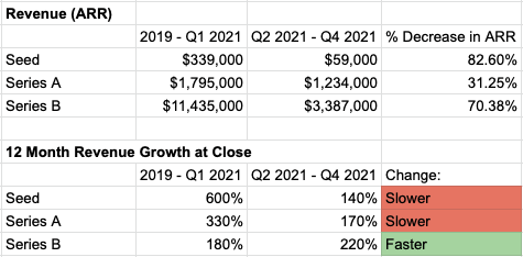 The data indicates that seed, Series A and Series B rounds have seen a recent and rapid decline in revenue reported by the SaaS startups raising. It also shows that seed and Series A software companies raised with slower growth rates from 2019 through Q1 2021.