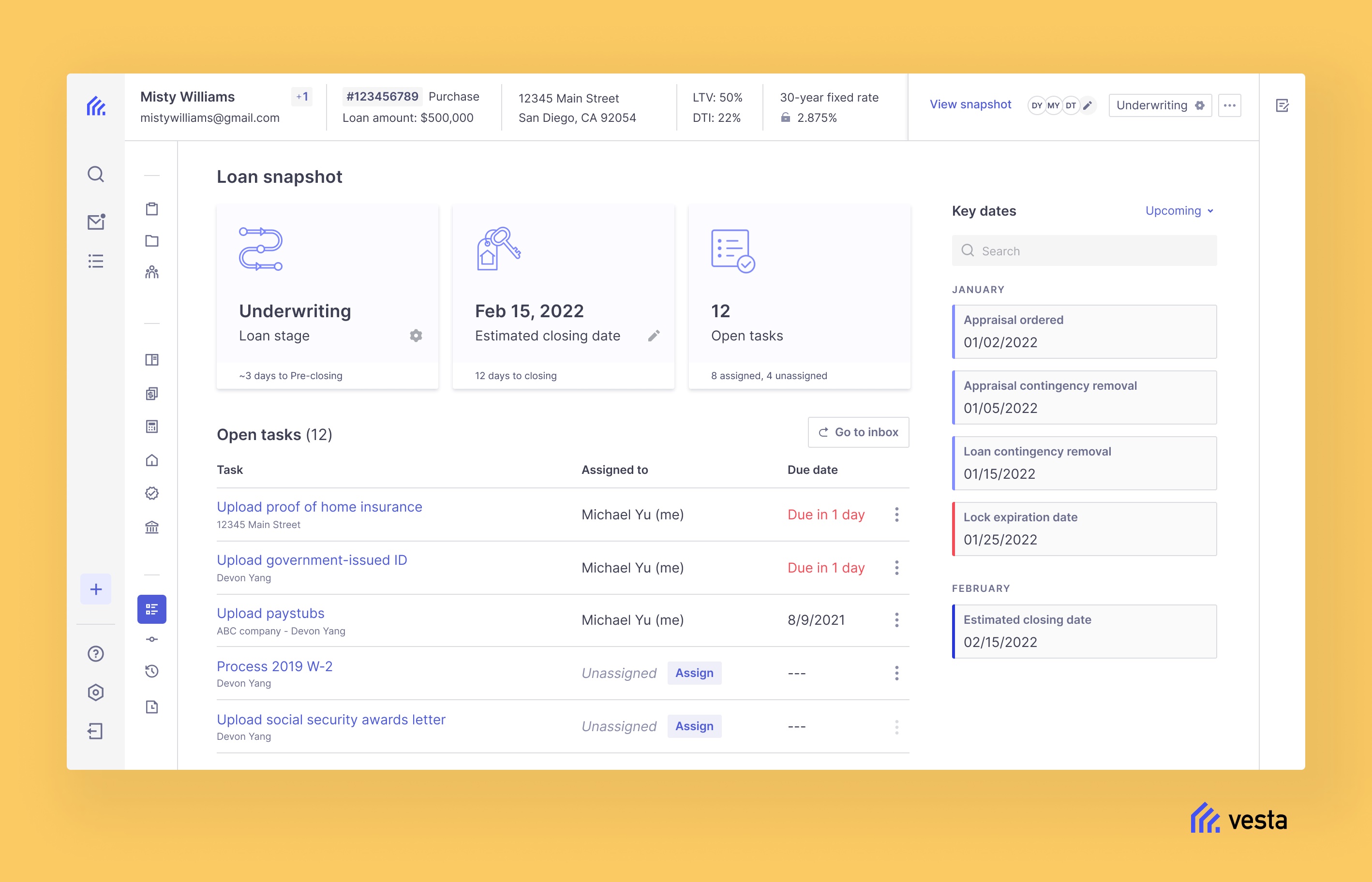 And today, Yu and Yang’s new company, San Francisco-based Vesta, is announcing it has raised $30 million in Series A financing led by Andreessen Horowitz (a16z) with participation from new investor Zigg Capital. Existing backers Conversion Capital and Bain Capital Ventures also participated in the round, bringing the company’s total raised since its November 2020 inception to $35 million. In a nutshell, Vesta’s technology aims to provide a customizable platform for mortgage origination, supporting approval, underwriting and the closing and funding of home loans.