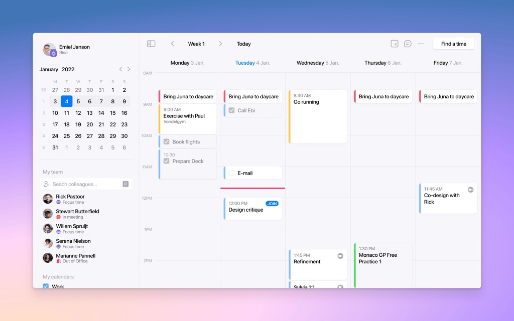 Meet Rise, a new startup working on a calendar app that is specifically designed for team work. Rise helps you see what you have planned, check what your team is doing right now and, more importantly, schedule meetings that are as convenient as possible for the whole team.
