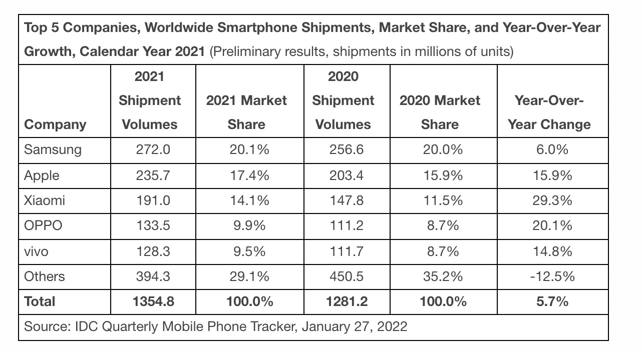 While China continues to be hit strongly by supply chain constraints, the No. 2 and No. 3 smartphone markets experienced growth in 2021.