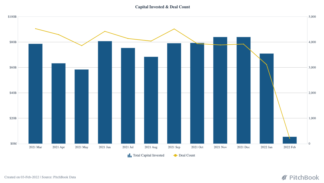 Recall that venture capital data is laggy, so the January bar in the above chart will likely fill in a little bit more in the coming weeks. Which means that, thus far in 2022, we’re seeing private-market investment nearly precisely on par with Q4 2021, which was a simply insane quarter. Even more, venture capital dollar volume in 2022 is sticking to its 2021 cadence more generally, which means that, well, times are not changing for startups at the same pace that we’re seeing them molt for public tech companies.