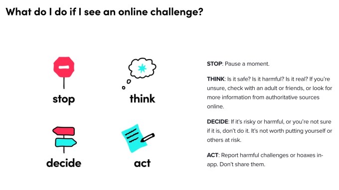 Today, TikTok says dangerous acts and challenges will also be broken out into its own policy, and it will launch a series of creator videos as part of a broader PSA-style campaign aimed at helping TikTok’s younger users better assess online content. These videos will relay the message that users should “Stop, Think, Decide, and Act,” when they come across online challenges — meaning, take a moment to pause, consider whether the challenge is real (or check with an adult, if unsure), decide if it’s risky or harmful, then act by reporting the challenge in the app, and by choosing not share it.