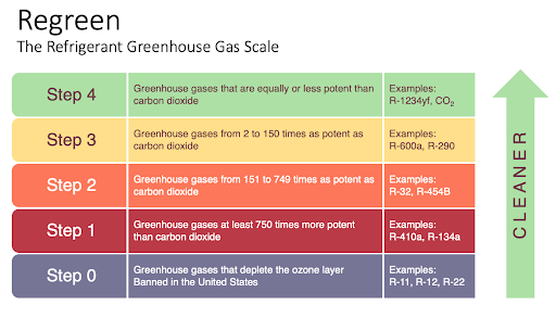 Thanks to some fast-moving legislation in the 1980s, we no longer use refrigerants that damage the ozone layer. In the Regreen Scale, which is inspired by the air quality levels that are used to track wildfires, we describe these ozone-depleting refrigerants as “Step 0” refrigerants.