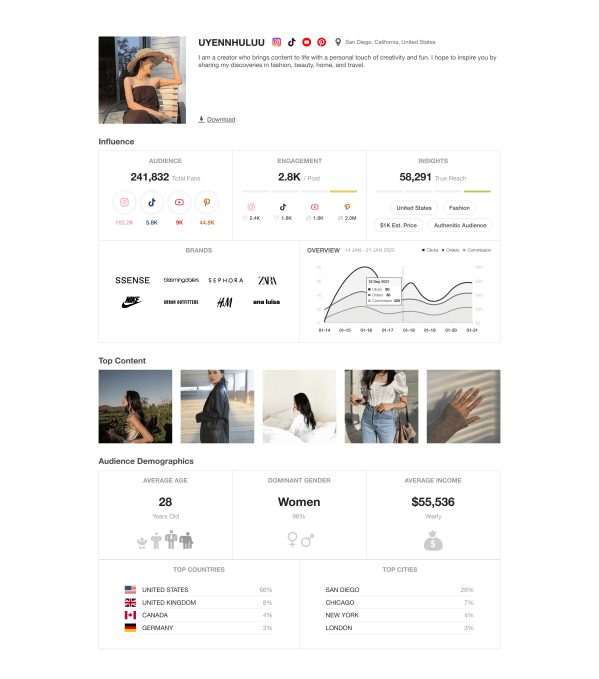The products are showcased on online storefronts that creators can customize with their own text, colors and links. On the back end, it offers creators analytics detailing their shop’s engagement, audience demographics and more.