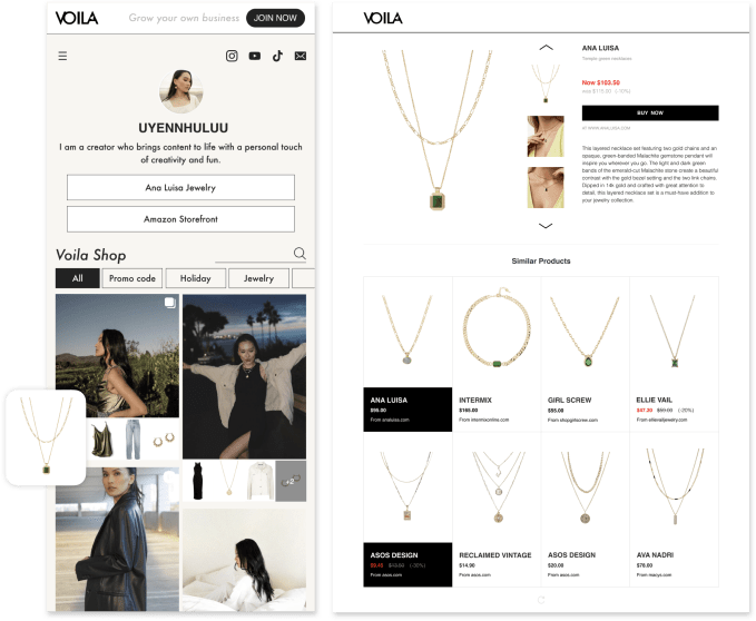 Voila, a startup building infrastructure for social commerce, is bringing concepts from China’s e-commerce market to the U.S. The company offers an alternative to the “link in bio” solutions used today by creators, like Linktree and Beacons, which direct followers to creators’ social profiles, personal websites and other recommendations. Instead of a link list or landing page, Voila creates AI-powered customizable, shoppable storefronts by automatically detecting items in the creators’ online content, then generating shoppable links.
