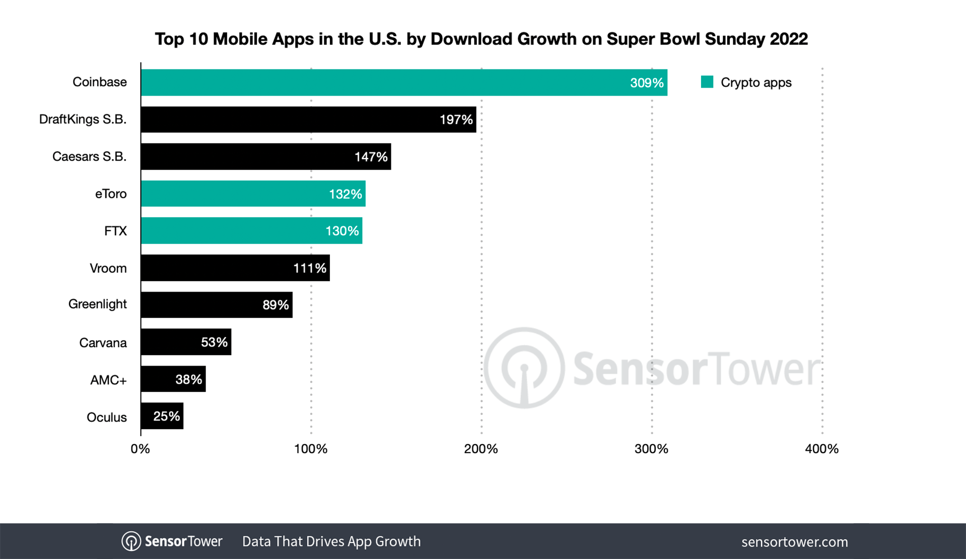 The Super Bowl ad spots paid off for a number of tech companies, not just in terms of exposure, but also app installs, a new report indicates. But Coinbase’s viral ad — which just bounced a QR code around on a black screen like the old DVD screensaver — outperformed the group, with installs jumping 309% week-over-week after the ad’s airing Super Bowl Sunday, February 13, and it continued to climb by another 286% the following day, according to Sensor Tower data.