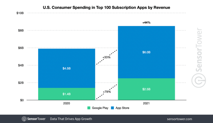 The U.S., again, saw a similar trend. Here, the top 100 subscription apps on the App Store grew 33% year-over-year from $4.5 billion in 2020 to reach $6 billion in 2021. Subscription apps on Google Play, meanwhile, grew 79% from $1.4 billion in 2020 to reach $2.5 billion in 2021.