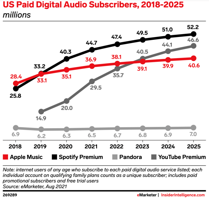 According to estimates from Insider Intelligence (previously eMarketer), Amazon Music will surpass Pandora this year to become the music streamer with the second most number of users in the U.S. Notably, this study includes users on both paid and ad-supported plans for these services — so, while Apple Music has an estimated 38.2 million subscribers, compared to Amazon Music’s 52.6 million or Pandora’s 49.1 million, none of Apple’s subscribers are on a free, ad-supported plan (though they could, of course, be on a free trial).