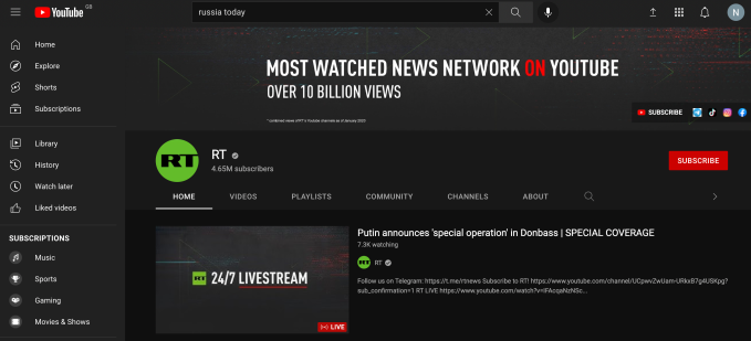 The channel’s marketing even claims it is “the most watched news network on YouTube” — with a touted 10BN+ views — which looks more than a little awkward for Google in the context of Putin’s land war in Europe.