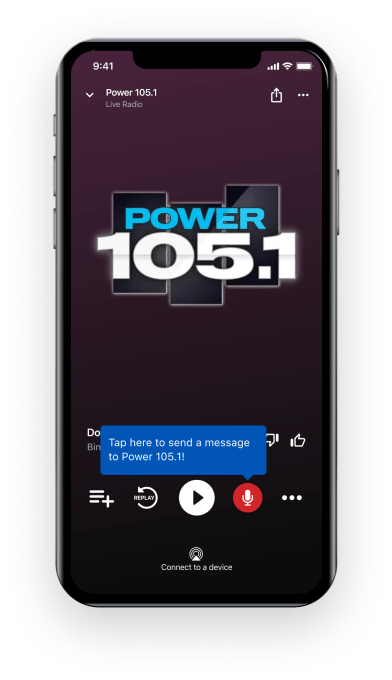 In the current version of the iHeartRadio app, there are a couple of ways to access the new Talk Back feature. Its red microphone button will appear on the full-screen player page for the show or podcast, and there’s a Talk Back button on the station’s profile or podcast’s profile page, too.
