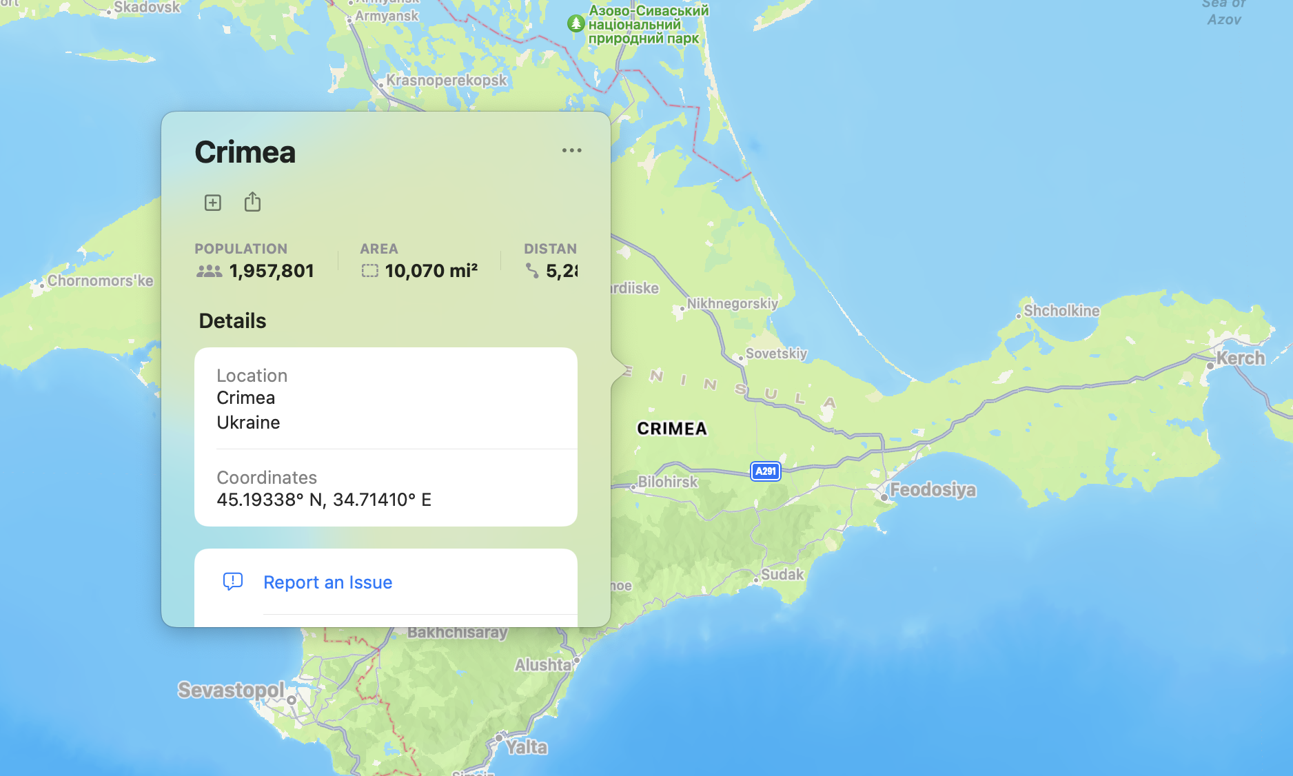 Apple Maps now shows Crimea as part of Ukraine when viewed outside of Russia, in what appears to be a new and quiet update. Mashable first reported the change, which comes amid Russia’s ongoing invasion of Ukraine. Now, when you search or click on Crimea, it is displayed as Ukrainian territory. Apple did not respond to TechCrunch’s request for comment regarding the change and has not publically addressed the matter.