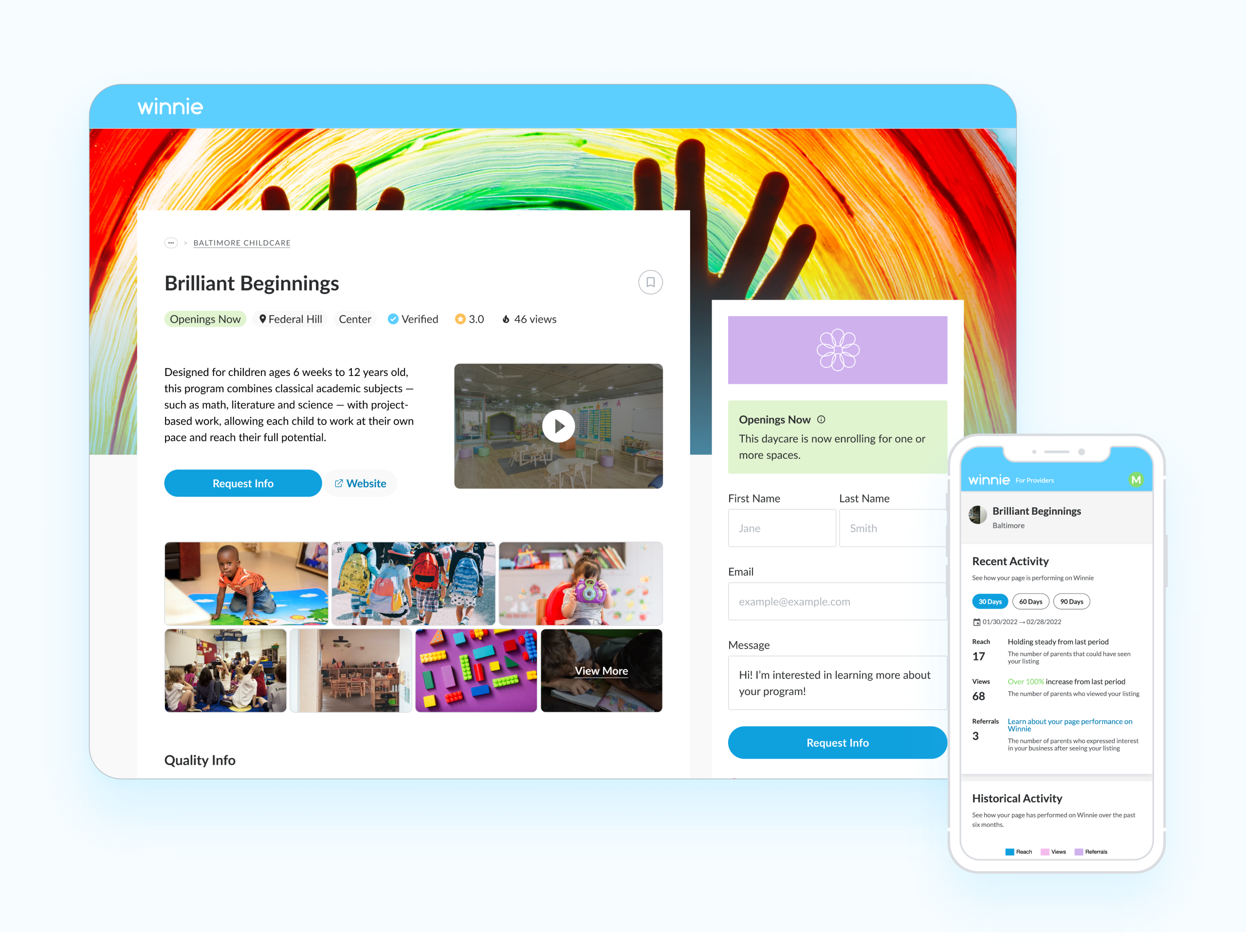 To start, it’s as simple as helping smaller operations launch profiles, landing pages and aggregate information in one spot. Winnie says that over half of the 250,000 daycares and preschools on the Winnie platform don’t have their own website, aka their Winnie profile is the sole way that parents can find them. And for the customers that may already have their own websites, Winnie thinks it can help by giving centers a landing page — full of reviews, program details, education types, licensing information and verification — where parents are already heading.
