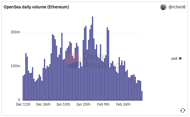One such dashboard was compiled by Richard Chen, an investor at crypto venture group 1confirmation, which centers on OpenSea data, allowing us a look into the platform’s volume. For example, observe the following: