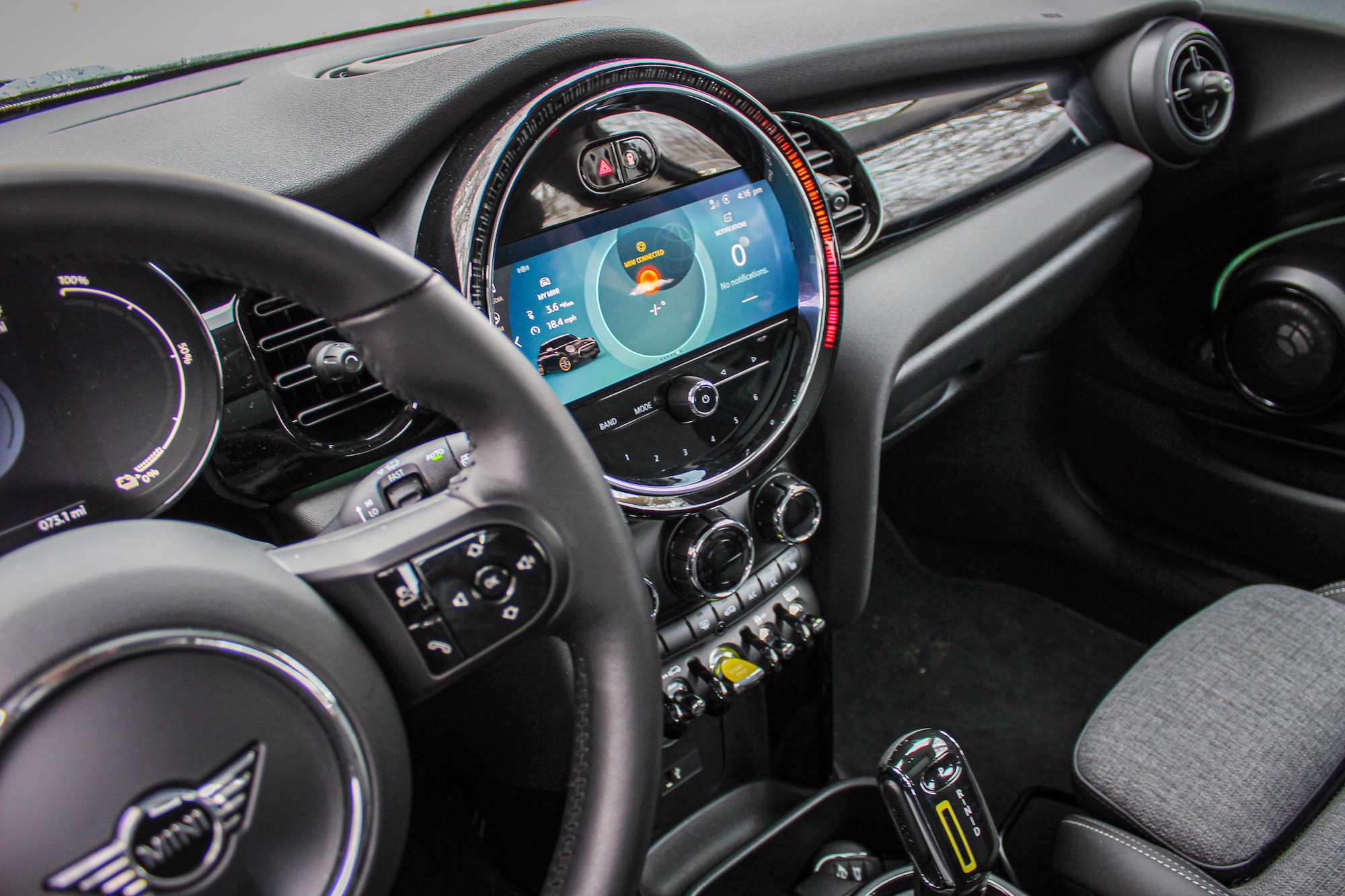 The rest of the physical inputs are very chunky and substantial, from the aircraft-like switches to the dials for the HVAC. Everything is laid out in a reasonable, functional way and with these, it’s rare that you are searching for that moment’s desired input. This is fortunate, because driving the Mini SE is an active experience.