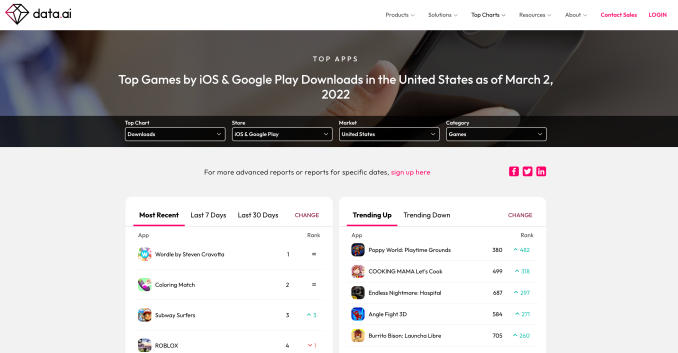 - Data.ai (formerly App Annie) made its daily app, game and SDK rankings Top Charts free for anyone to use. The charts cover more than 190 countries and 46 app store categories in a customizable view.