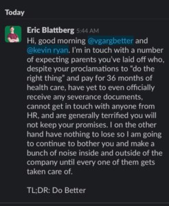 After I wrote all of the above, I came across a LinkedIn post from a Better.com employee who on March 11 was asked to resign a week early after publishing an internal communication from the company on social media. Senior product designer Eric Blattberg publicly pushed his employer — including directly communicating with CEO Vishal Garg and CFO Kevin Ryan on LinkedIn and Slack — to provide additional severance pay and extended insurance benefits to the expecting parents who were being laid off. The company reportedly pledged to offer these employees extended COBRA benefits for 12 months, as reported by Bloomberg.