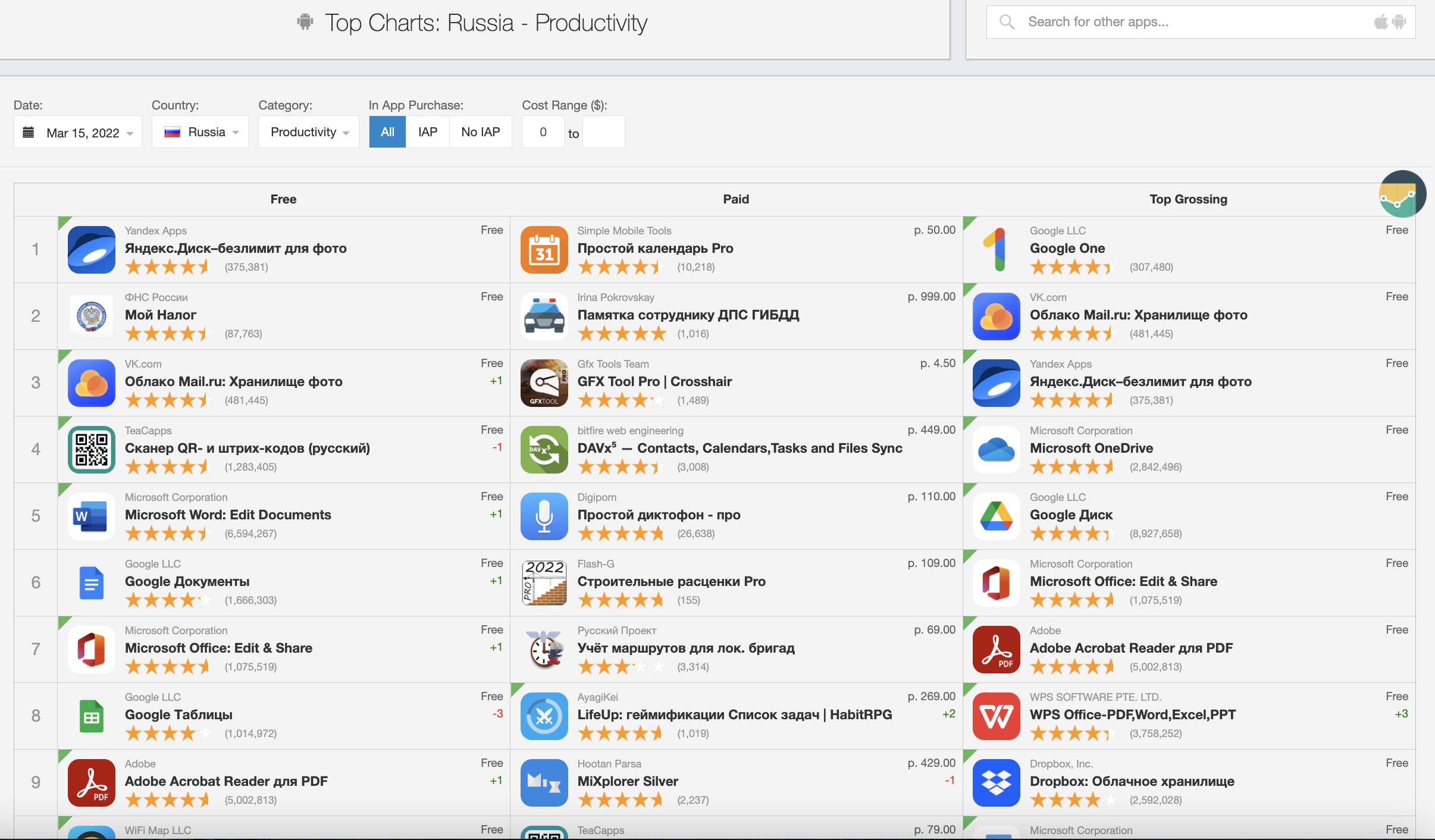 Microsoft is not alone. Google took several actions against Russia, including the suspension of its advertising business in the country, but its productivity apps are still available in Russia. Currently ranking highly on the Top Productivity apps chart are Google’s Docs, Sheets, Slides, Assistant, Calendar, Drive, One and Keep, for instance.