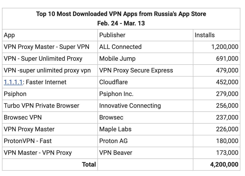 The top 10 VPN apps collectively reached 4.2 million installs from February 24 through March 13, up 2,286% from the prior period, when the top 10 apps hit about 176,000 installs, Sensor Tower data indicated. The firm noted it also saw apps like Cloudflare’s 1.1.1.1 and Psiphon appear in the Top 10, though the app dubbed 1.1.1.1 isn’t only a VPN; it advertises privacy and security, which likely appeal to Russian users at this time.