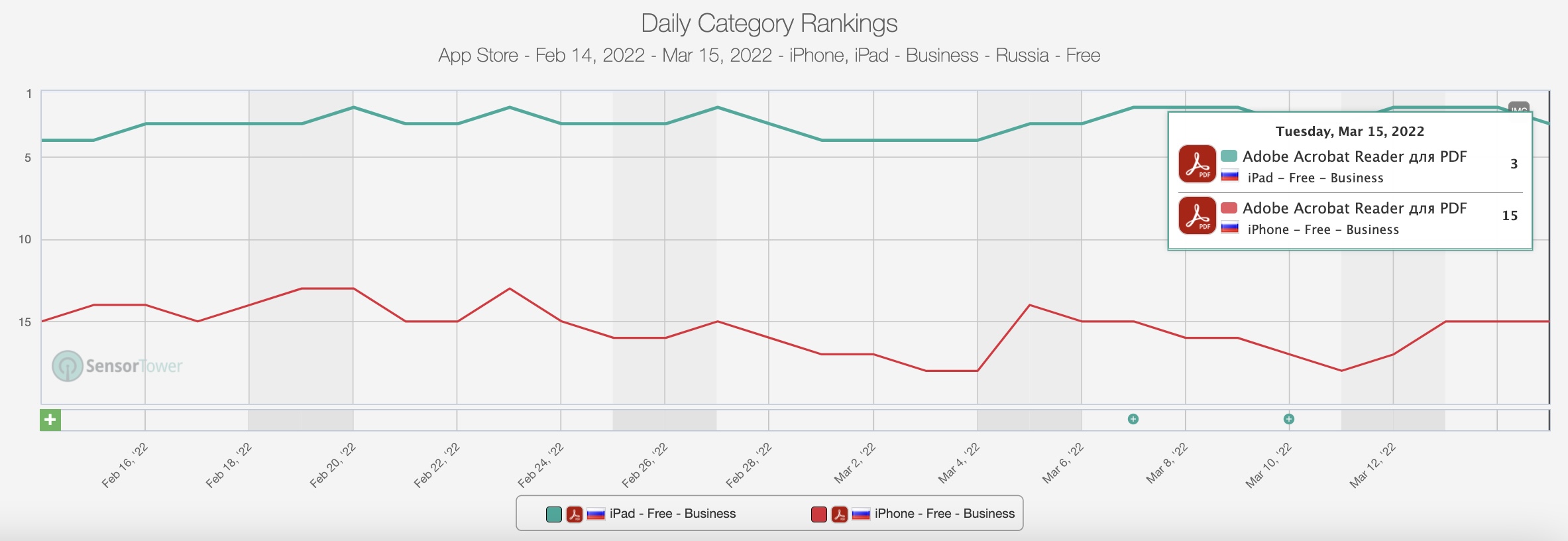 In the days since, Adobe has pulled some of its apps from the Russian App Store, like Photoshop and Illustrator, but others remain available for download, as of the time of writing, including a top-ranked Business app, Adobe Reader. Its iOS app is currently at No. 15 in the top Business apps chart.