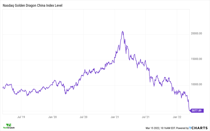 On the historical declines point, the NASDAQ Golden Dragon China Index tracks the value of U.S.-listed companies with a “majority” of their business “within the People’s Republic of China.” And oh boy is it a hot mess. I have never seen a chart quite like this one: